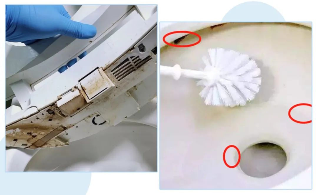 第二个不喜欢刷马桶的原因是,很多凹槽马桶刷根本够不到。比如侧面小出水孔、U型区、积水区以及马桶盖内部。