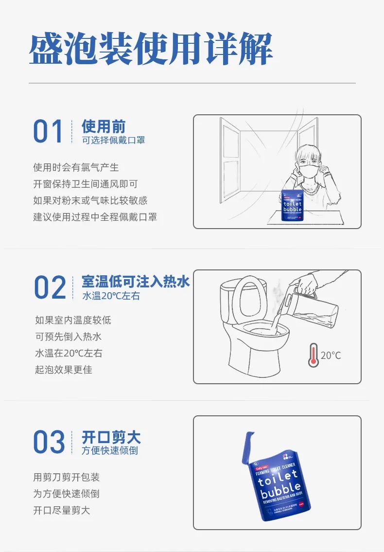 特别采用日本“激泡原理”,粉掉入马桶后,会瞬间产生大量绵密泡沫~脏兮兮的马桶池摇身一变,成了一汪清澈の蓝色海洋💦~~