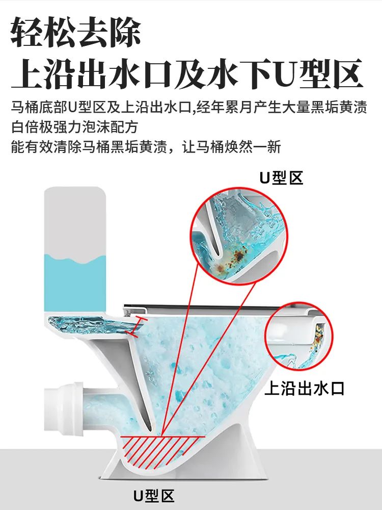 240g的大包专门用于清洁马桶底部的U型区,以及上沿出水口这些很难清洁的污垢。