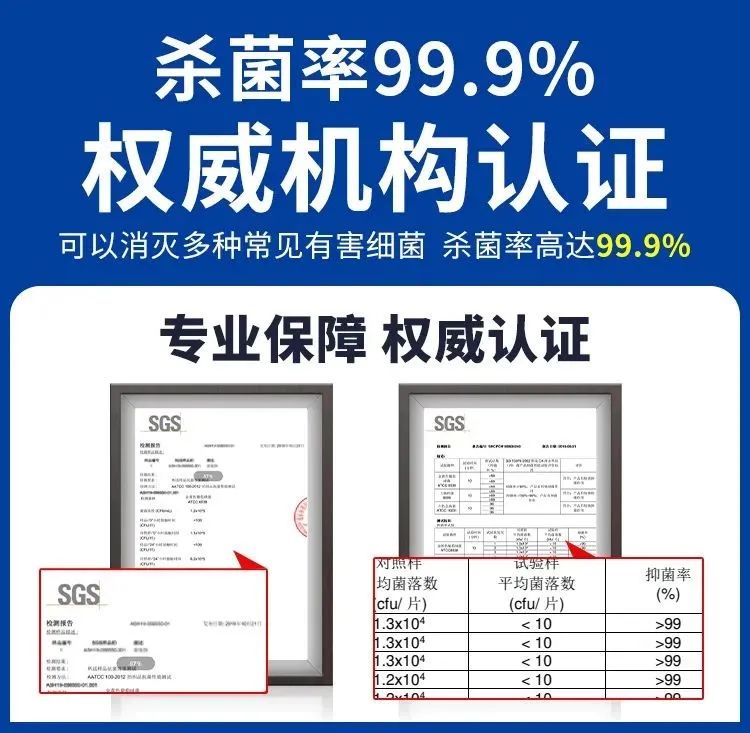 咱这款魔力泡泡采用含氯的高效除菌剂配方,权威检测抑菌率高达99.9%!