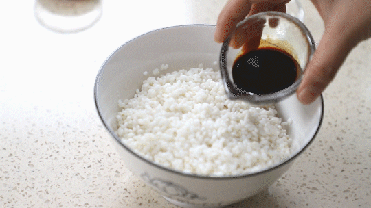 糯米提前用水泡2个小时,泡好后加入10克生抽、20克老抽、15克食用油,搅拌均匀,盖上保鲜膜腌制2个小时上色入味。