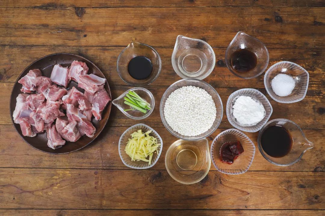 排骨 400g、糯米 200g、豆腐乳 2块、料酒 15g、生抽 40g、老抽 20g、白糖 5g、蚝油 10g、食用油 15g、淀粉 10g、姜丝 适量、葱段 少许