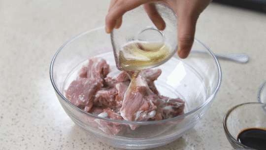 排骨洗净,用清水泡30分钟,再加入15克料酒、20克生抽、10克老抽、5克白糖、10克蚝油、2块腐乳、适量姜丝、少许葱段、10克淀粉,充分抓匀,腌制1个小时。