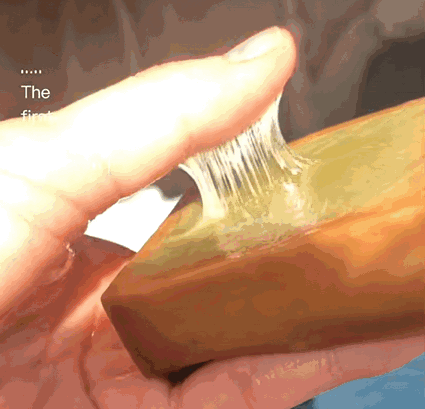首先将口罩浸泡在水中10~20秒后,用手轻轻揉搓,就会出现拉丝现象。