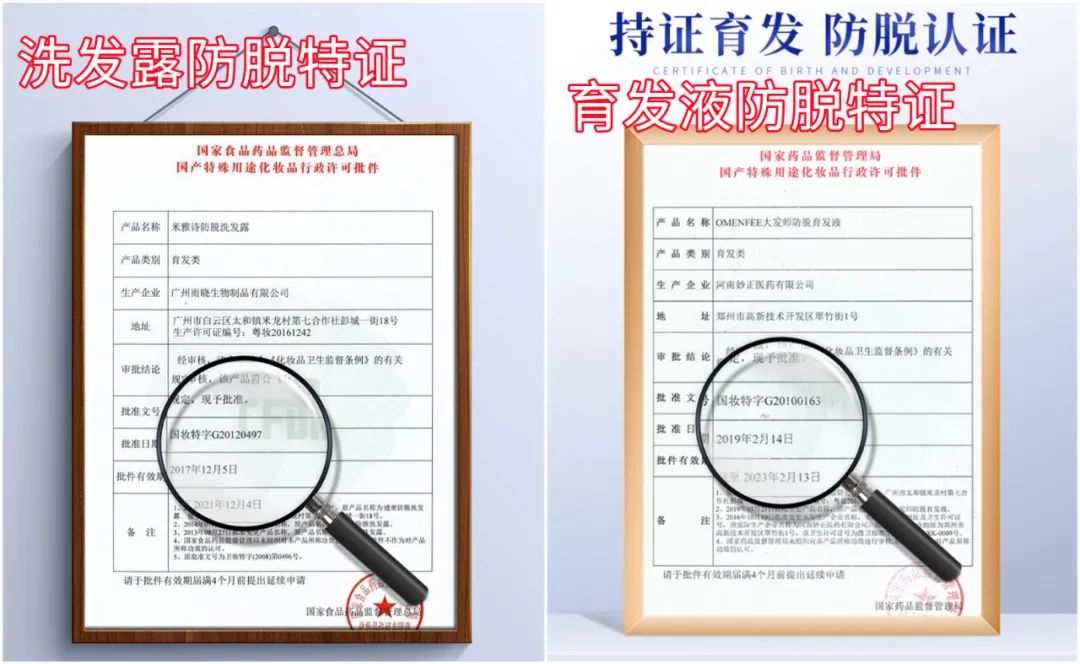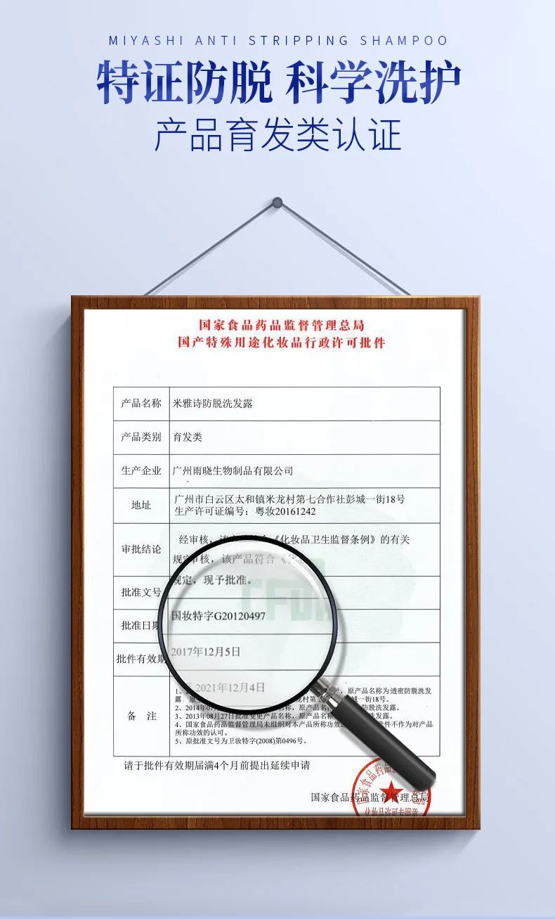 在上市之前,还获得了国家认证的防脱特证,而且洗发水和育发液都各自持特证上岗,强强联合。这张特证可不好拿,首先要经得起长达2~3年的真人实测跟踪,具有真实的防脱效果;其次真人实测的样本数量规模要大,对更多人有效,具有更普遍的参考价值;还要温和不刺激,才能持有特证。也就是说,已经有机构部门帮我们筛查过好几轮,真正能防脱。无论是压力型脱发,熬夜型脱发,油脂过旺型脱发……它都能救。