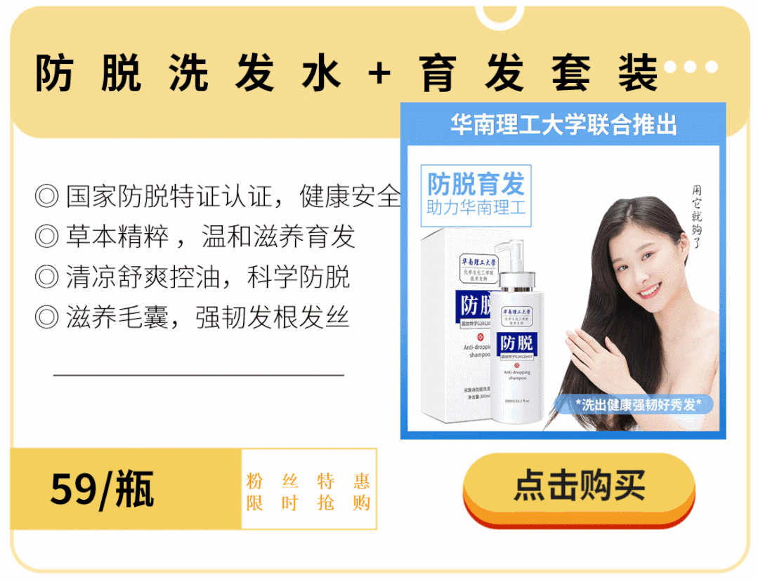 华南理工大学是国家双一流建设A类高校名单的重点大学,也是国家的高等学校的科技成果转化基地。这套防脱育发套装,就是由华南理工大学联合研发的科学实力派。包含一瓶防脱洗发水,和一瓶育发液。无论是洗发水还是育发液,都获得了国家认可的育发类特证,实实在在是脱发友人福音。而且天然的植物提取物,唤醒毛囊,强韧发根,同时给头皮控油,才能帮助控制脱发,长出新发。平时先用洗发水洗好,再把育发液均匀喷在发根处按摩吸收即可。也可以单独使用,但组合用起来,洗发水防脱,育发液生发,效果更好。实验室也做过真人实测,使用一段时间,光秃秃的头顶、M字发际线,都有了一定的改善,头顶浓密,发际线饱满,整个人看上去年轻多了。自从看到我头上长出小绒毛以后,二嫂也跟着一起用。之前她不知道在哪里看的偏方每晚用用生姜涂抹头皮,再用专门的针扎刺激头皮,头顶依然稀疏。而且使用方法也简单,讲究效率的男生也不怕麻烦,一洗一喷,轻轻按个摩,看个电视的时间就能搞定。程序员小陈,薪水可观,但工作压力大,经常熬夜加班,原来黑黝黝的头发早变得又软又稀疏,之前相亲也大都因为秃头被拒绝。用过这套以后,不仅新发冒出来了,原来软塌塌的发丝也一起变强韧,告别油腻大叔,重回小鲜肉的状态,前不久还顺利脱单。不仅头顶挽救回来了,一直倒退的发际线也在逐渐回归。头发浓密了,颜值和自信也跟着上涨。更重要的是,价格也很美丽,原本一瓶洗发水88元、育发液88元,套装169元。今天最高直降70元。一瓶洗发水59元,育发液59元,组合套装仅99元。