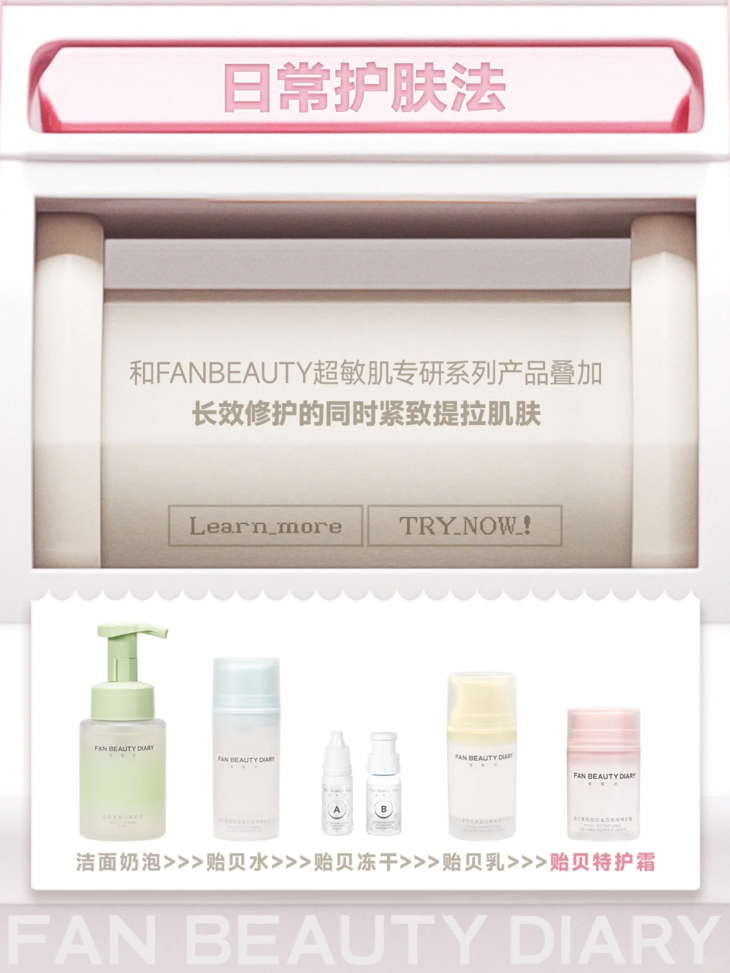 1⃣日常护肤法和fanbeauty超敏肌专研系列产品叠加,长效修护的同时紧致提拉肌肤