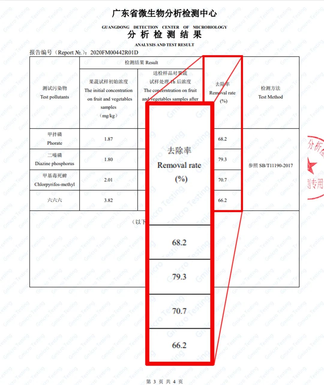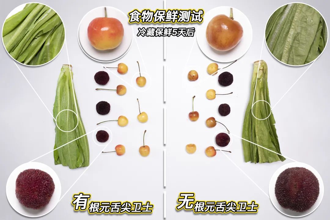 而普通冷藏这组,检测值为45,细菌含量直接多1倍,相当于变质腐烂程度也多1倍!对冰箱常见细菌,达到了95%-99%的除菌率。连“冰箱杀手”——李斯特菌,也做到99%除菌。每次打雷下雨后,空气都会特别清新,原因之一就是雷电生成臭氧,净化空气。根元舌尖卫士去味除臭的原理,也如此。它与冰箱中异味源发生反应,将其氧化分解,达到除臭效果。实际除臭吸附分解率高达94.3%,除臭效果被数据量化,更加科学、真实、值得信赖。轻度冰箱异味,一晚上就减轻非常多!重度异味,几天内也有改善。小小一个不占地,简直是角落里的“冰箱守护神”,不愧是「舌尖卫士」。蔬果在储存时会分泌一种植物激素——乙烯,它相当于催熟剂,越坏的水果分泌越多。老人常说:坏水果不要和好水果放在一起,不然好的也会很快变坏,原理正如此。而根元舌尖卫士,通过释放臭氧消耗乙烯,抑制蔬果成熟,延长保鲜期。品牌方做了实测,将两组蔬菜分别密封84小时后,有根元舌尖卫士的蔬菜仍然新鲜,但普通放置的菜则已经腐烂!看细节,杨梅、油麦菜已经出现差异。尤其在樱桃上,效果更加直观!同时因为瓜果蔬菜,多少会有农药残留。根元舌尖卫士不仅做到保鲜,还能降解农药残留。启动1小时后,对甲拌磷、二嗪磷、甲基毒死蜱、六六六四种常见农药,做到66%-79%的去除率!臭氧杀菌的技术非常成熟且安全有效,被广泛应用于食品领域,比如餐厨消毒柜、水果消毒机等。食品消毒安全剂量,限定臭氧浓度应≤0.05PPM。而根元舌尖卫士的臭氧浓度仅为0.006,仅是限定浓度的八分之一,对人体无毒无害。我们特意做了测试,将开启后的根元舌尖卫士和鱼同时密封,小鱼也没有出现任何异常反应。因为低浓度的臭氧,释放后即被分解成氧气,不会有残留。而且根元舌尖卫士是间断性工作,不会全天24小时释放臭氧,对人体更安全。常规档,指示灯为蓝色慢闪状态。适用于日常维持冰箱卫生、降解农残、祛异味。加强档位,指示灯为蓝色常亮状态。适用于冰箱异味、细菌滋生严重情况。电量耗尽后充电就好(约5小时),臭氧模块不受影响。正常情况可用5年,性价比非常高。市面上的冰箱保鲜去味产品很多,但像根元这样有资质、有检测报告、有安全保障的产品其实很少!是一套可以帮你和家人朋友解决冰箱细菌问题的方法论。到手1年内出现产品质量问题,根元有「只换不修」的售后政策。