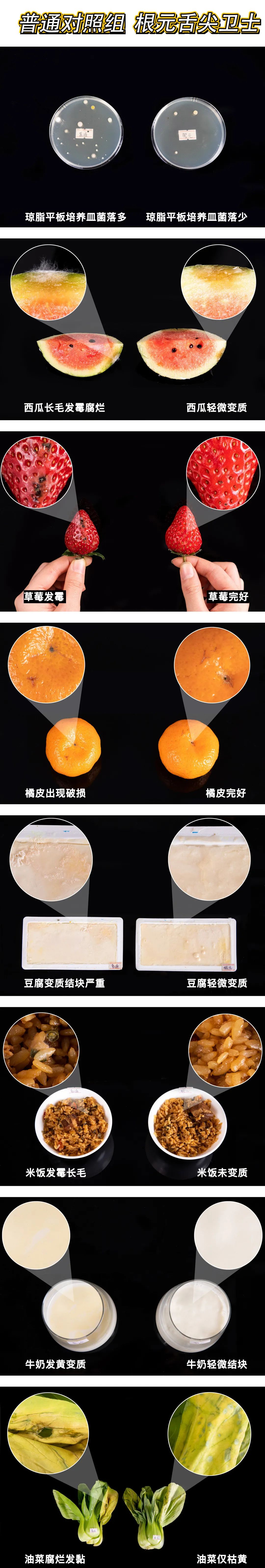 易感人群:孕妇、婴儿、儿童、50岁以上人群、免疫系统较弱的人等。*冰箱用得时间久、不常清洗、放得东西杂...慢慢就变成了「细菌窝」。舌尖卫士利用冰箱低温高湿的环境,模拟雷电产生臭氧来破坏细菌的生存环境,科学阻断细菌繁殖。蛋身中部设计有无数孔位,臭氧从这里释放,溢散到空气中,破坏细菌的生物结构,同时杀灭细菌。我们用仪器试了下,未经任何处理的冰箱,在冰箱表面取样检测后,细菌值为240。24小时后,继续取样检测,检测细菌数量下降为51,降了将近5倍!效果立竿见影!并且第二天我们打开后,冰箱真的有“被打扫过的感觉”,异味全清!将食物分组记录,再放入平板培养皿作为菌落生长参照物。有根元舌尖卫士的食物,只有轻微变质。而另一组则严重变质生菌了...在冰箱冷藏环境下,我们的测试更为苛刻,加入了生肉以及海鲜产品。同样将其放入两个密封箱内,其中1组放入根元舌尖卫士。二者看似差别不大,但“普通”这组还是在鱼肉上出现轻微变质。