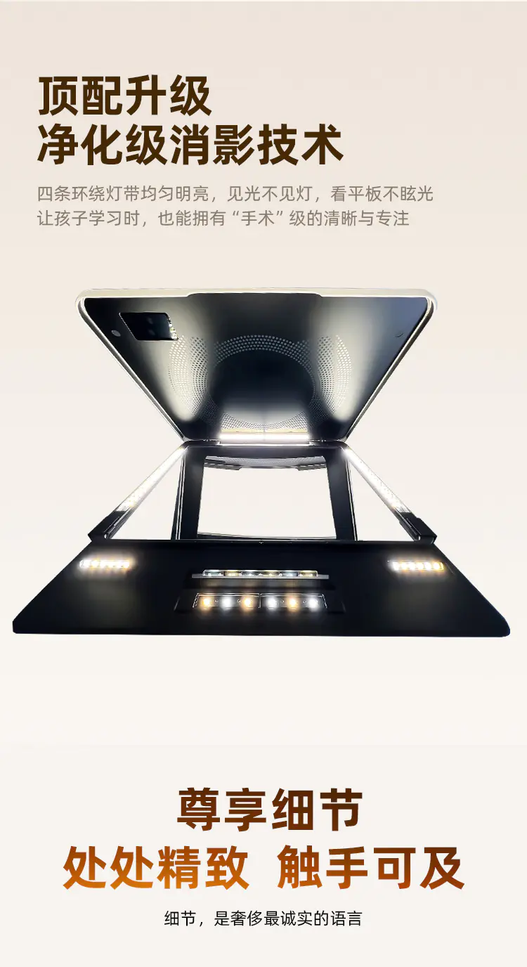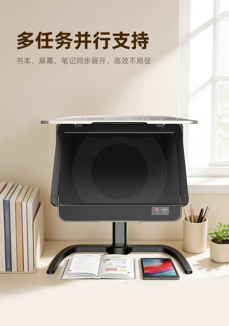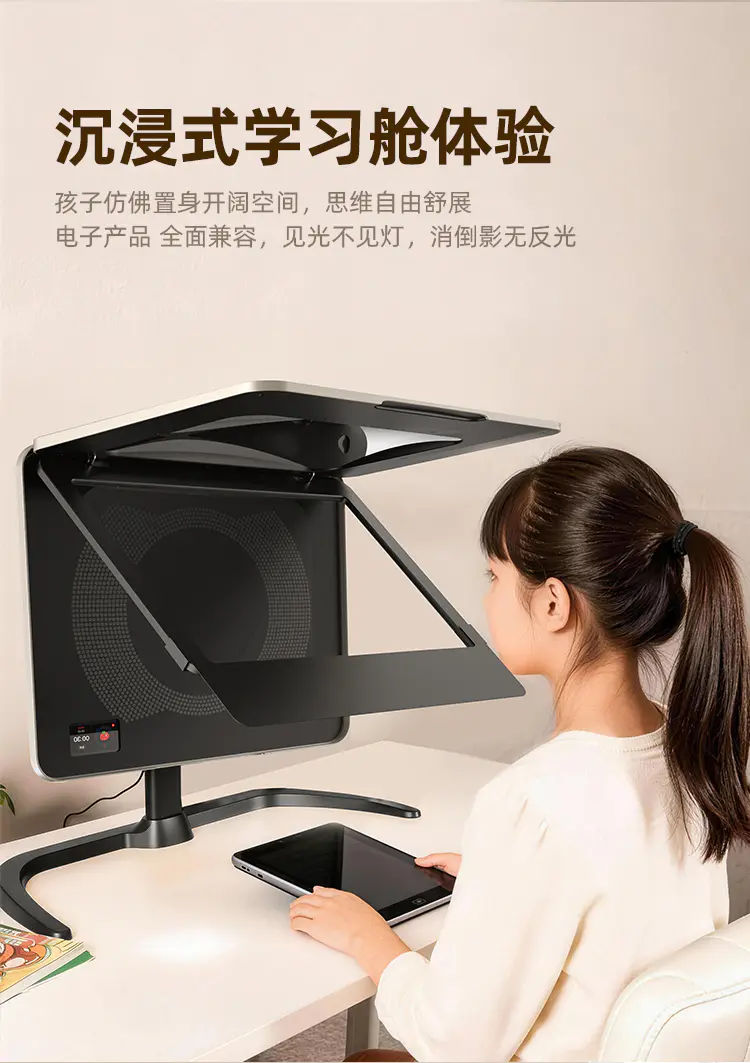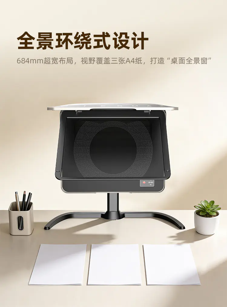 搭载第三代远像光学引擎,450mm 大分光镜(面积 + 38.2%)、380mm 宽幅曲面镜(面积 + 11.7%)、680mm 超宽支架,覆盖 3 张 A4 纸视野,Pad 与书本可同时清晰呈现,适配多元学习场景。
