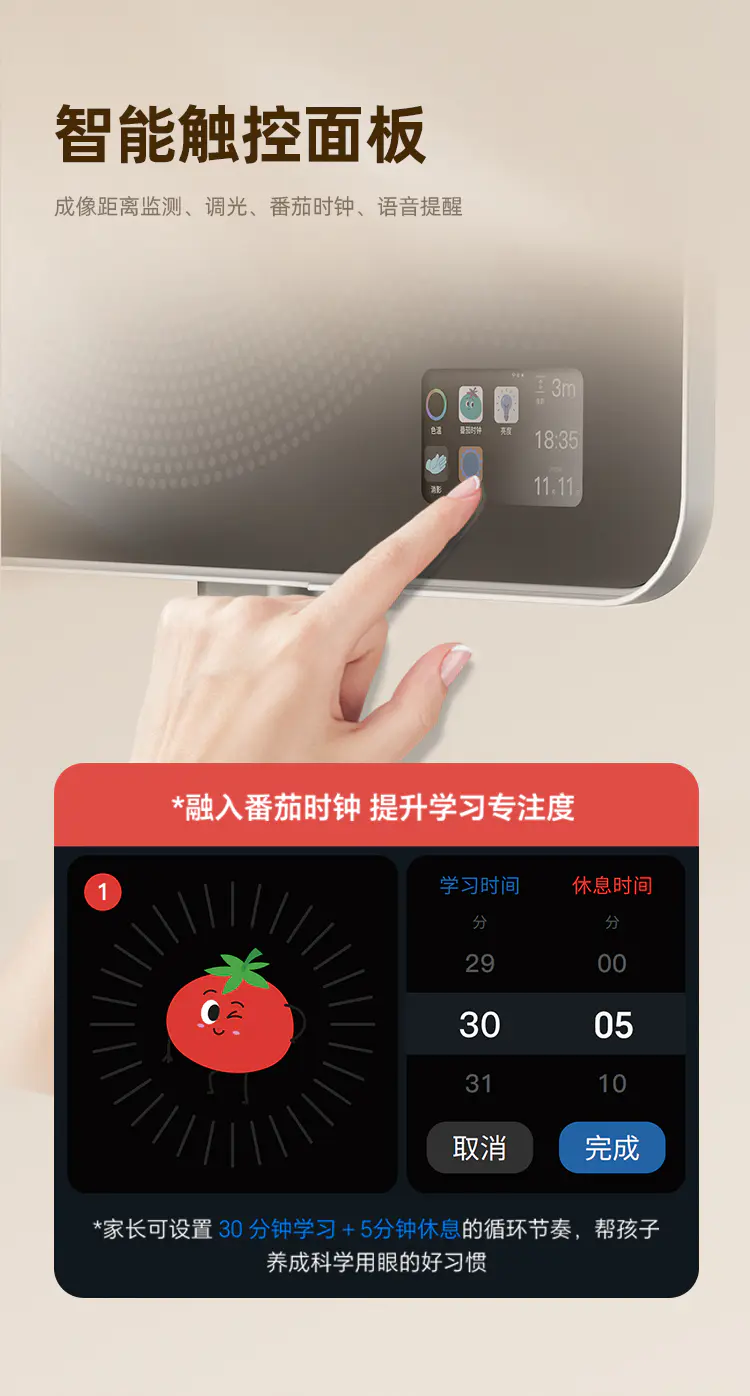 云智能平台支持蓝牙 + WiFi 连接,生成用眼数据报告;智能触控屏集成多功能操控,番茄时钟助力养成科学用眼习惯,家长守护更省心。