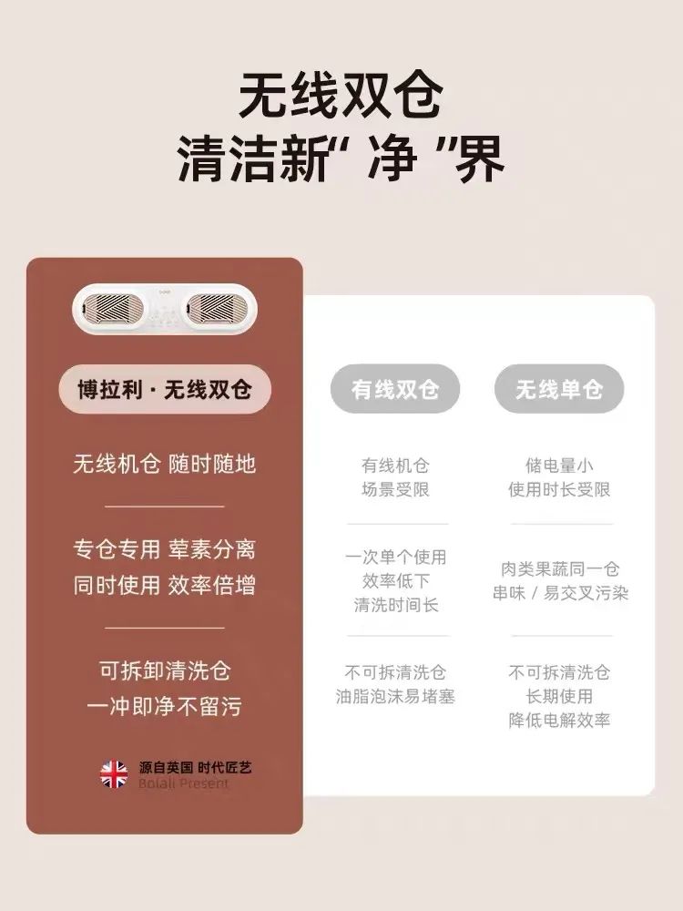 另外bolali果蔬机额定功率为32W,各个清洗仓的功率为16w,比有线的功率小、比便携式单仓的功率大。
