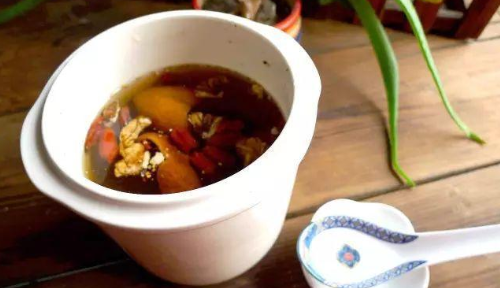 食材有:生栗子6个(保留内皮,切两半)、生核桃6个(去壳留皮)、莲子6个、枸杞15克,葡萄干15克,陈皮5克。干莲子提前浸泡,所有食材一起下锅,加水煮开后,再煮40分钟即可。