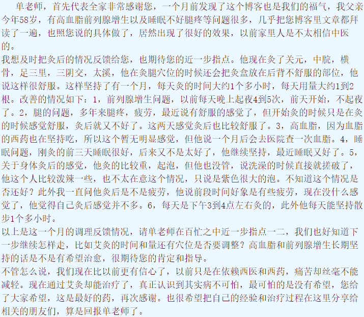 以上是这一个月的调理反馈情况,请单老师在百忙之中近一步指点一二,我们也好知道下一步继续怎样走,比如艾灸的时间和量还有穴位是否要调整?高血脂和前列腺增生长期坚持的话是不是有希望治愈,很期待您的肯定和指导。