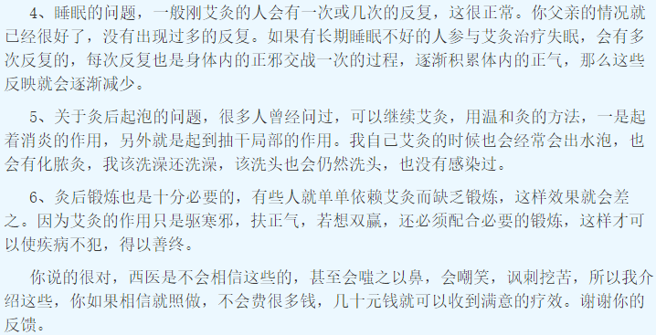 4、睡眠的问题,一般刚艾灸的人会有一次或几次的反复,这很正常。你父亲的情况就已经很好了,没有出现过多的反复。如果有长期睡眠不好的人参与艾灸调理失眠,会有多次反复的,每次反复也是身体内的正邪交战一次的过程,逐渐积累体内的正气,那么这些反映就会逐渐减少。