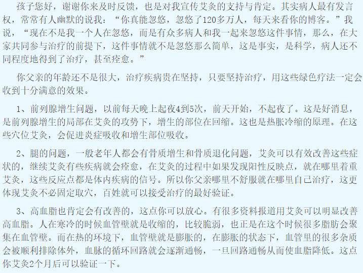 我想及时把灸后的情况反馈给您,也期待您的近一步指点。他现在灸了关元,中脘,横骨,足三里,三阴交,太溪,他在灸腿穴位的时候还会把灸盒放在后背不舒服的部位,他说这样很舒服。这样坚持了有一个月,每天灸的时间大约1个多小时,每天用量大约1到2根。改善的情况如下:1,前列腺增生问题,以前每天晚上起夜4到5次,前天开始,不起夜了。2,腿的问题,多年来腿疼,疲劳,最近说有舒服的感觉了,但开始灸的时候只是在灸的时候感觉舒服,灸后就又不好了。这两天感觉灸后也比较舒服了。3,高血脂,因为血脂的西药也在坚持吃,所以这个暂无明显感觉,但他说一个月后会去医院查一次血脂。4,睡眠问题,刚灸的前三天睡眠很好,后来又不是太好了,他继续坚持,最近睡眠又好了。5,关于身体灸后的感觉,他灸的比较重,起泡,但他也没管,说洗澡的时候直接就搓破了,他这个人比较泼辣一些,也不太在意这个情况,只说是紫色很大的泡。不知道这个情况是否还好?此外我一直问他灸后是不是疲劳,他说前段时间好象是有些疲劳,现在没什么感觉了,他觉得自己灸后感觉并不多。6,每天是下午3到4点左右灸的,此外他每天能坚持散步1个多小时。