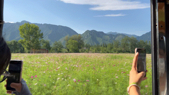 小车穿梭在葡萄园和花海之间