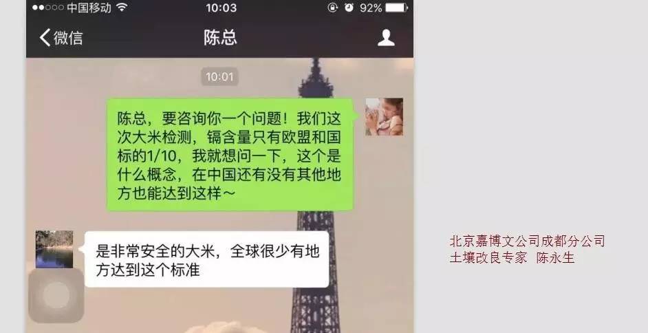 面对如此数据,我们需要更为专业的解释。于是,我们通过朋友,找到中国土壤改良行业领头公司——北京嘉博文成都分公司的陈总,陈总通过微信,给我们的回复是这样的:“是非常非常安全的大米,全球很少有地方能够达到!”