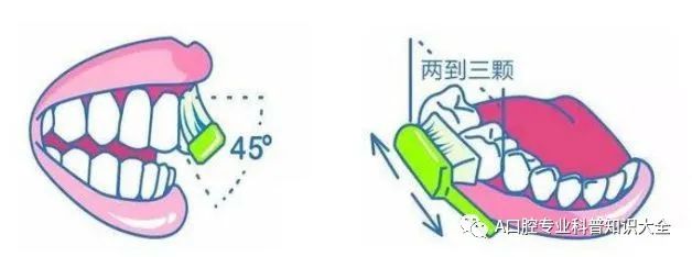 刷毛应从每颗牙的牙颈部,以与牙长轴呈 45°角,刷毛指向牙根方向(上颌牙向上,下颌牙向下),轻微加压, 以 2-3 颗牙齿为一组, 以短距离(约 2mm)水平颤动牙刷约 10 次,然后拂刷牙面,再移至下一组牙, 重复同样动作直到全部刷完。