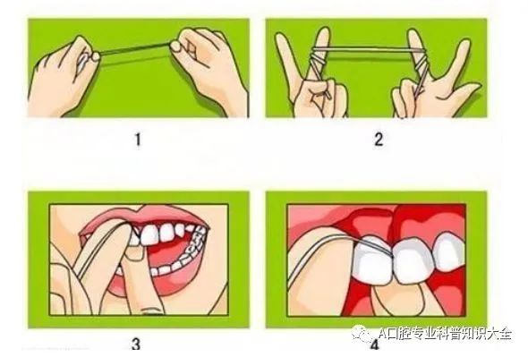 2. 牙线要使用两手的指头各绕三圈固定,保证不会脱落,也不要系的太紧,影响指头血液循环。