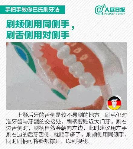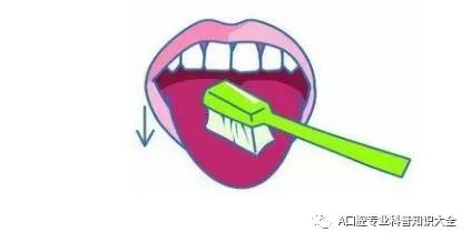 刷牙时张大嘴,从一侧最后一颗牙刷至另一侧,重复颊侧面的刷牙动作,刷完上排再刷下排。