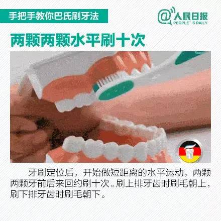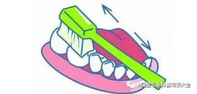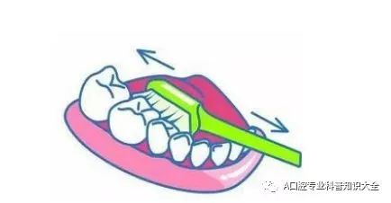 手持刷柄,刷毛指向咀嚼面,稍用力做前后来回刷, 注意上下左右区段都必须刷到。