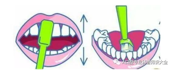 刷前牙舌侧面的时候将刷头竖放在牙面上,使前部刷毛接触龈缘或进入龈沟,做上下提拉颤动,自上而下拂刷,不做来回拂刷。刷下前牙舌面时,自下而上拂刷。