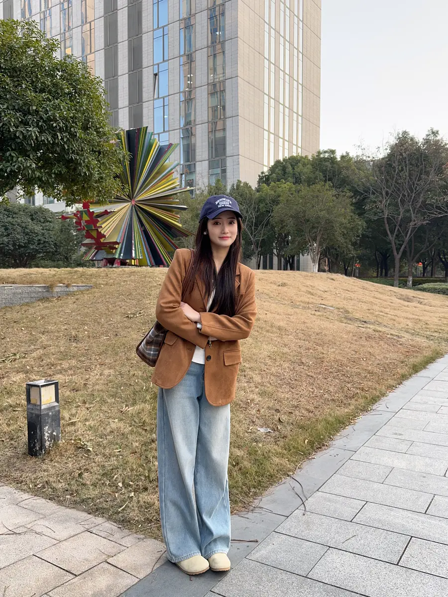 外套的质量超级好,是小宽松版的,穿着很舒服。西装的设计也很独特,仿麂皮的材质摸着很柔软,非常喜欢!