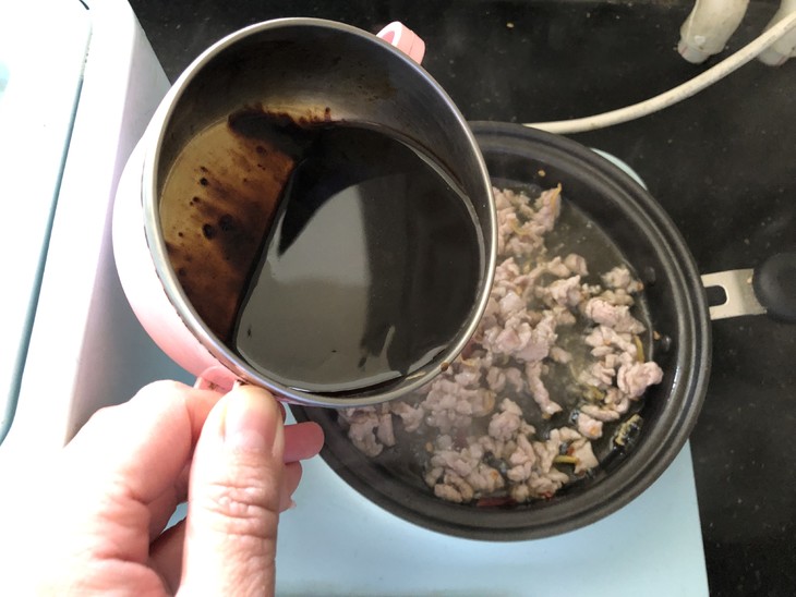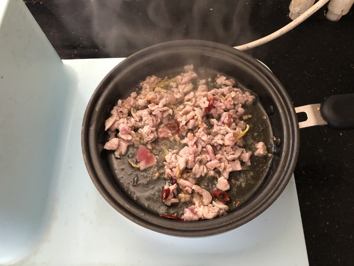 2.早餐机炒锅放油烧热,放入姜丝和辣椒炒香,再倒入肉末翻炒均匀。