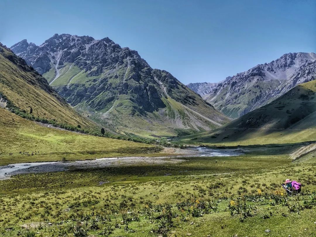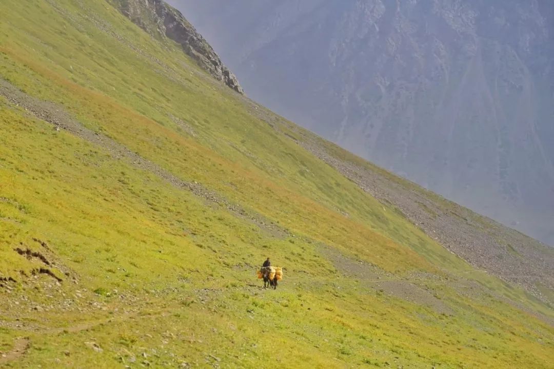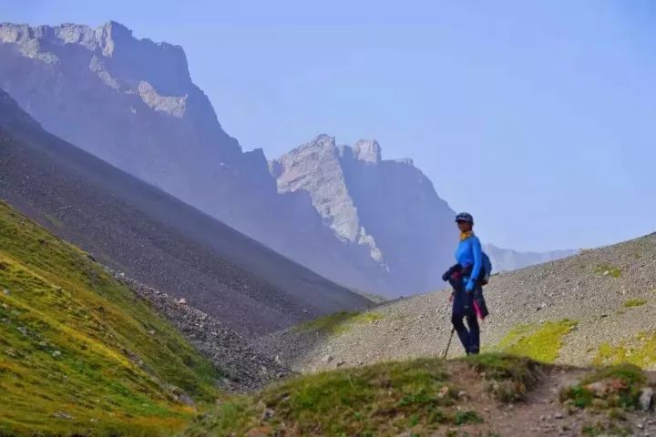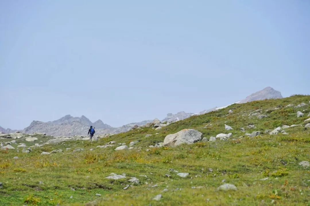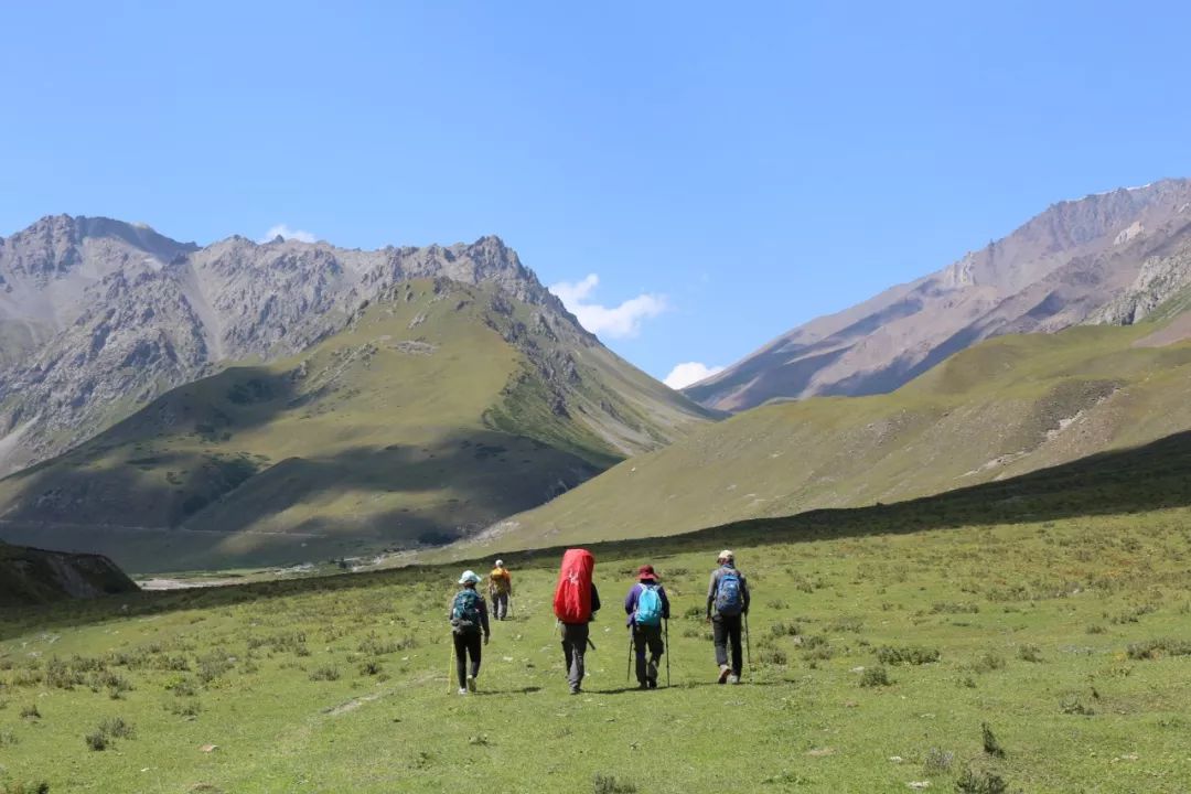 从早上离开营地开始,窝窝就戴上了耳机,一路没有一句话,而且行走的速度也明显比前两天慢。我问她还好吗?得到的回答是肯定的。停下来休息时,不放心,又问了一次,这次她终于说可能是早上喝的奶茶让她觉得胃不舒服,有些恶心。食物大概是个原因,高原反应也同样会引起反胃。有时她的缄默如同大山,而这时的她多半选择了默默忍受。经历了EBC以及长长短短的徒步,她的综合素质和五年前刚起步时判若两人,恐高也不再是障碍,加之这次的强度并不大,所以我并不担心。翻过垭口就进入了乌兰萨德克牧场。继续沿河水向西行走。两边是绿色的山脉,青草碧连天,牛羊悠闲吃草,仿佛这里是上天宠爱之地,一改前两天粗粝的黑白画风,变得清新悦目,抚慰心灵。身处辽阔天地,自然用沉默的语言让我明白,虽然我们不过是天地间匆匆过客,却一样可以拥有高山的胸怀,流水的清澈,小草的谦卑与顽强。