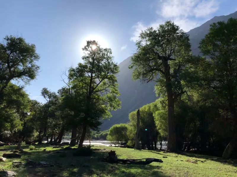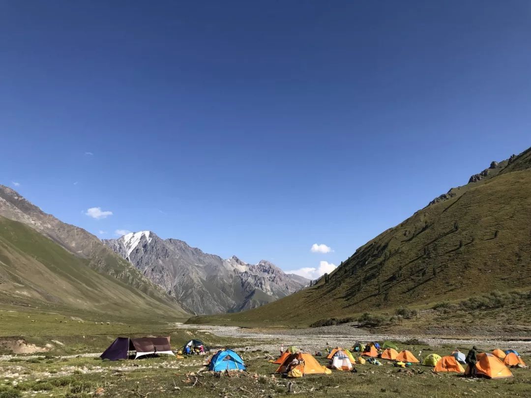 新疆和西藏一样,与内地有两个小时的时差,所以此刻的4点就相当于2点,太阳当空照,羊儿咩咩叫。我们各自安营扎寨扎好帐篷,把睡袋拿出摊在草地上晾晒,晚上就可以枕着阳光的味道入眠。趁着天光正好,去河边洗脸、刷牙、洗胳膊洗脚。背着阳光坐在一个小石块上,有风吹过,小河在眼前哗哗流去,慵懒惬意,不忍离去,于是没忍住把头发也洗了。寒冷的河水流过发根,有一丝清凉浸润心田。头发在太阳下晒干,太阳是最好的烘干机。昨晚夜里很冷,冻得我穿上外衣在睡袋里缩成一团。来之前的召集会,没敢让领队检查,现在自食其果。厚着脸皮去问凉爽,幸亏他知道北京老吴多带了一床儿童睡袋,把借来还是新的睡袋套在自己睡袋之外,解了我的燃眉之急。真是在家靠父母,出门听领队,也特别感激老吴的热情相助!