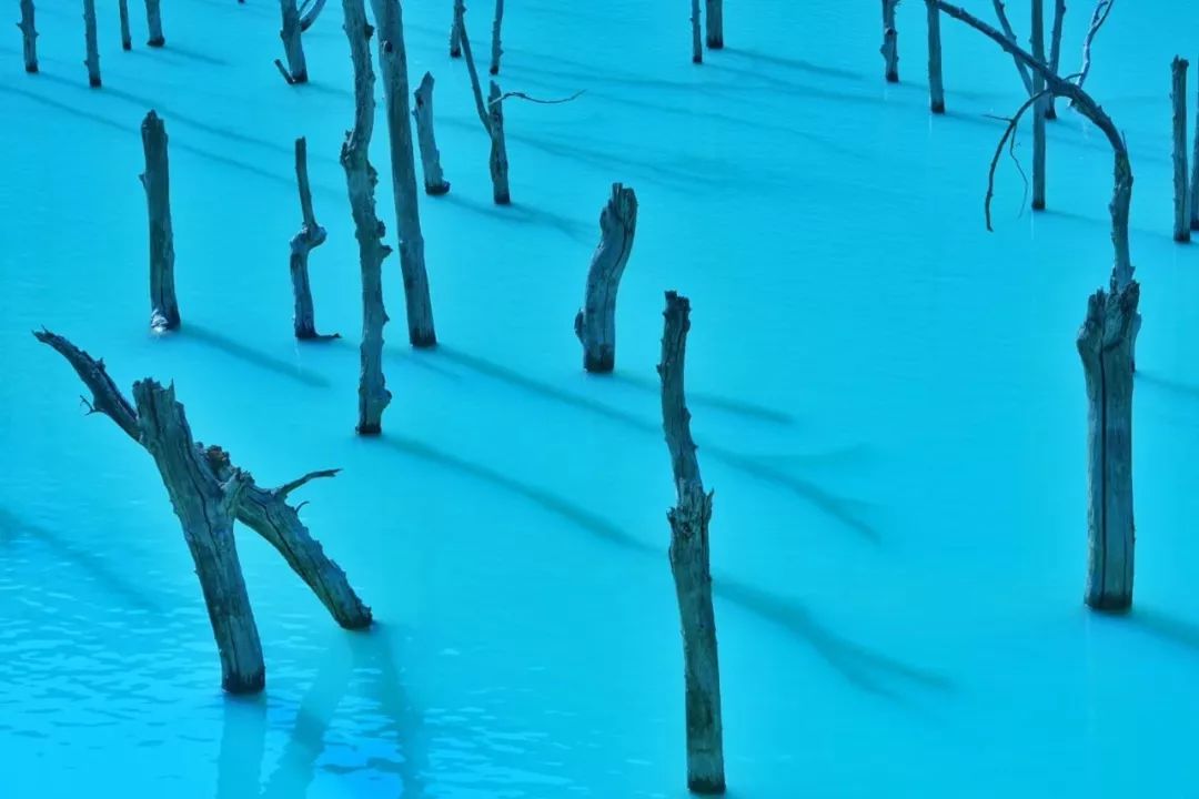 营地在湖边的一小片空地上,遥望天湖,风景宜人。想必这个位置也是前期探路者精心的安排。每条线路,每处细节见真情。天湖不大,却拥有自己独特的气质。那些遍布河中已失去生命的树干,默默叙述悲伤故事。是树成就了湖水,还是湖水成就了树?生命与死亡就这样完美呈现在眼前,空灵凄美,宁静而悠远。