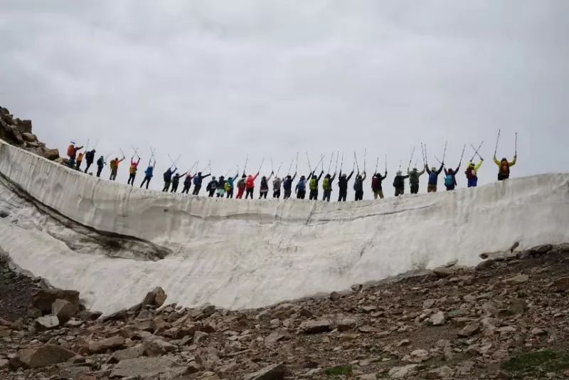我们一行人中午到达天山山脉婆罗科努山的达板哑口。婆罗科努山是天山支脉。蒙古语为"灰色的院子"。海拔3495米,是此行的至高点,垭口也是乌苏和伊利的分界线。大家在垭口处的冰川上拍照留念,同来自北京的默飞大哥还即兴跳起了舞。