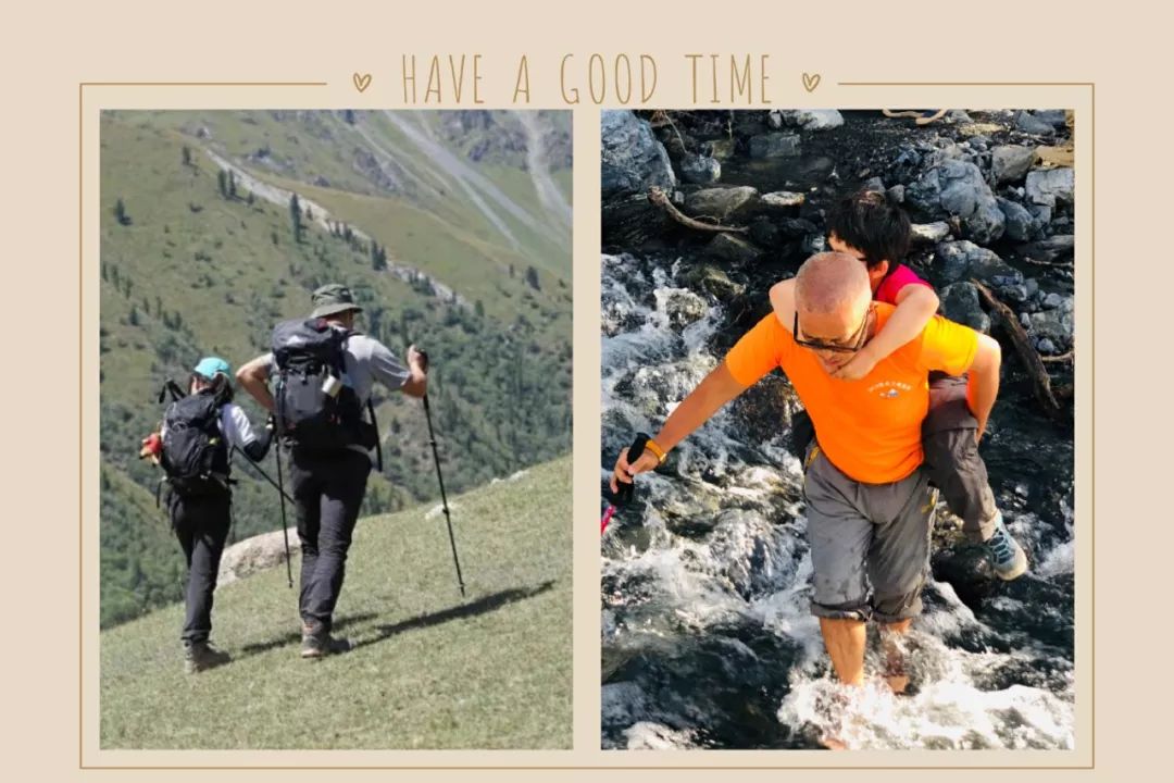 不用像走山路那样排成一列,而是三五成群,走着聊着,时不时停下来拍拍景,就要离开群山怀抱,有些不舍。此时两位小朋友应该最开心,终于即将顺利完成艰巨的挑战。此行的队伍里有两对儿父女:来自广州的一渡父女,女儿十岁,还有来自北京的老吴和他只有八岁的女儿。两个女孩儿表现不俗。八岁的小吴,一路跋山涉水,总是被父亲牵着手走在队伍前列,没听到叫一声苦。每次过河,老吴都会先脱下鞋袜趟水把背包放在对岸,再回来背女儿。对孩子既是慈父又是严师,这样成长起来的孩子应该是有爱又强大吧。