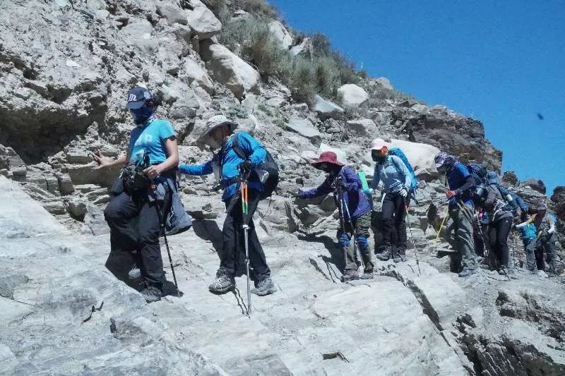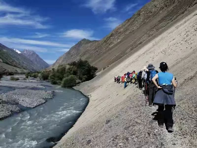 今天继续沿着奎屯河北岸逆流而上,山路弯弯曲曲上上下下,地面还是粗粝的大小乱石。上切到河谷,再一路慢下。时不时走过一些山体横切面,之后经过一片较为难走的滑石区。凉爽和白狼时刻提醒队员系紧鞋带,这样不至于在这样歪歪斜斜的道路上将脚崴伤。徒步靠得就是双脚,脚伤如同战士上战场而遗失了武器。徒步的过程,会走过条条道路,经历种种意想不到的情况,这要求人们不仅具备接受挑战的勇气,还需要专注、细心与沉着,因为任何一个疏忽和惊慌失措都有可能导致前功尽弃,甚至牵连整个队伍。
