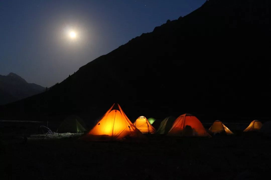 我和窝窝在相互帮助下搭好了各自的帐篷。此刻饭菜的香味从不远处的共用帐篷里飘来,几位领队已经开始为我们准备晚餐。他们每天抵达营地后和开拔前各烧两次开水,以确保每位队员的保温杯是满的。早、晚做两顿饭,晚餐均为四菜一汤。看到他们认真洗菜、切菜,在不大的煤气炉上烹饪,内心都有种莫名的感动。