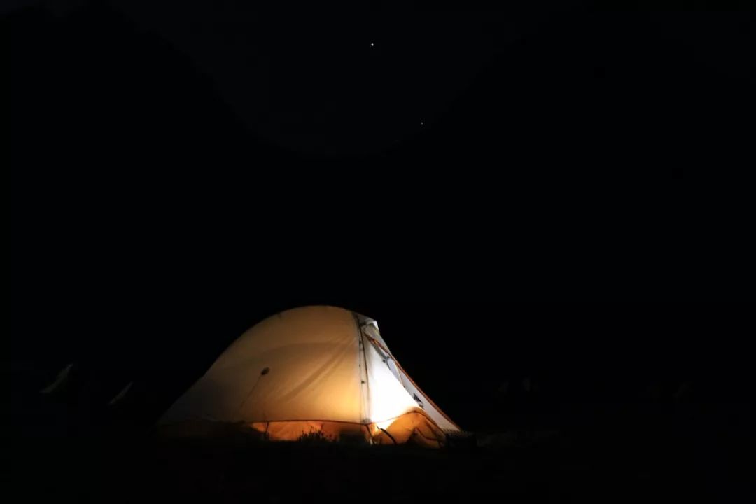 成龙离得远,一下子就看不见了。暮霭中还能看到正前方白狼的身影,他爬的很快,一会就成了一个移动的小黑点。我们能做的就是等待。终于,就在天将完全黑下来的时候,小D如同从天而降到了河对岸。也许因为注意力都在山上,不知他什么时候下来的,直到已近在咫尺。人群发出兴奋的声音,当事人反而一头雾水,大概没想到牵动了这么多人的心。好在他在黑夜来临前下了山,好在没有发生任何的意外,要不然今晚将是一个不眠之夜。悬着的一颗心终于尘埃落定。仔细看,很远很高的山上,有一闪一闪微小的灯光,那是白狼所在的位置。此时的他从对讲机得知消息,终于可以打道回府了。凉爽也让大家各自回帐篷安睡。