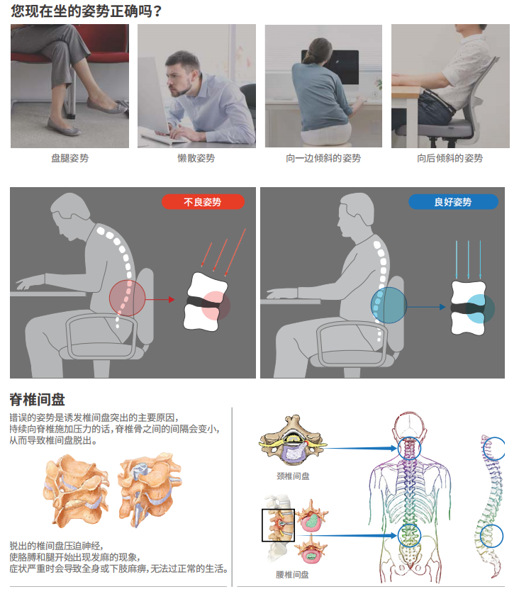 我们经常说的脊椎间盘突出,大部分都是通过日积月累不良坐姿引发,坐着的时候腰部承受压力最大,如果姿势不对,真的很伤腰