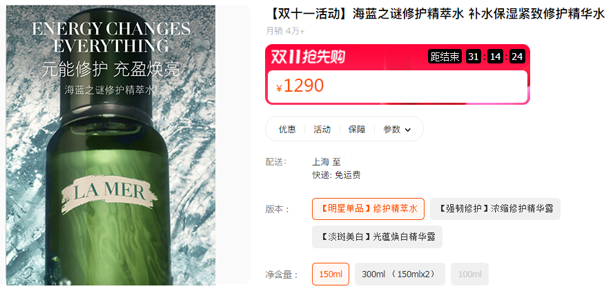 原价1290元/150ml,今天活动到手价589元!而且到手2瓶哦!!