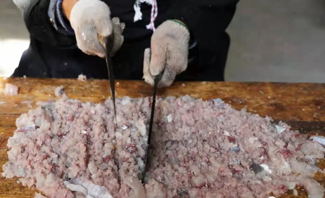 用刀单方向从鱼尾往鱼头方向一刀一刀刮取鱼肉至起茸