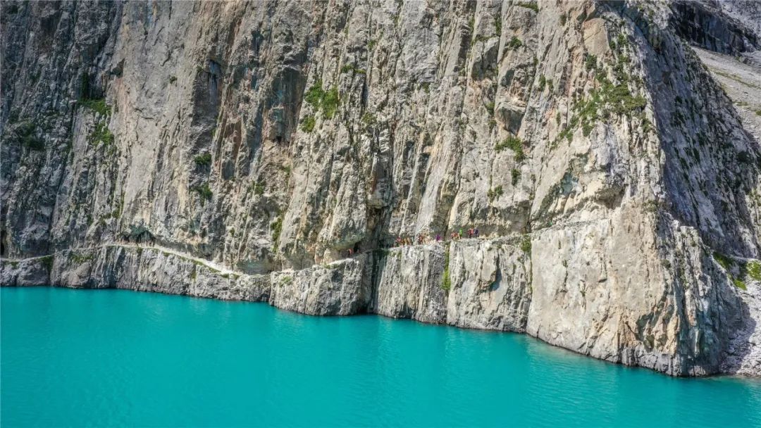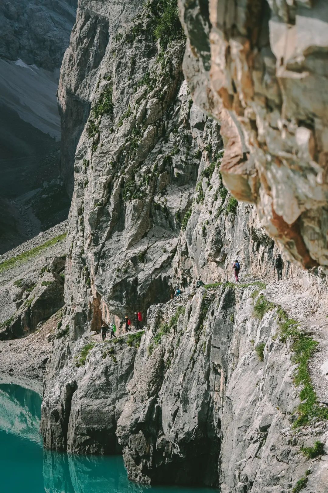 这是在垂直的岩壁上硬生生凿出的一条路,可怜的马儿就是从这里摔进了天堂湖,朋友圈传的绝美乌孙宣传照——老虎口也在这里。