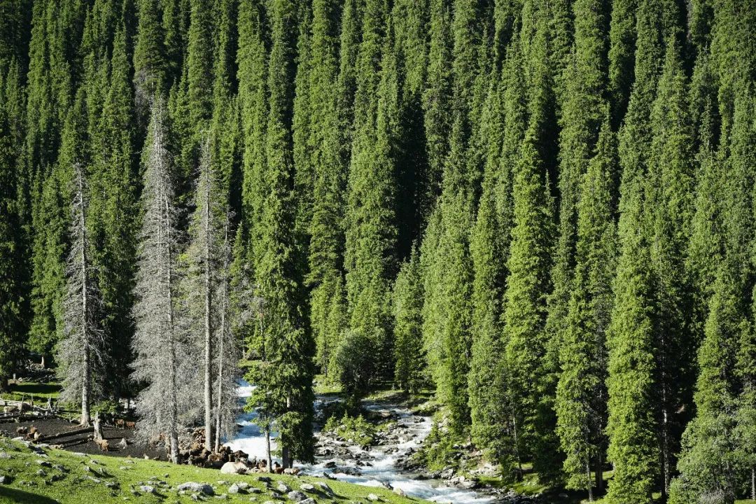 在巍巍天山深处,雪岭云杉苍劲挺拔、四季常青、攀坡漫生、绵延不绝,犹如一道沿山而筑的绿色长城。风吹林海,松涛声声,绿波起伏,其势如潮。