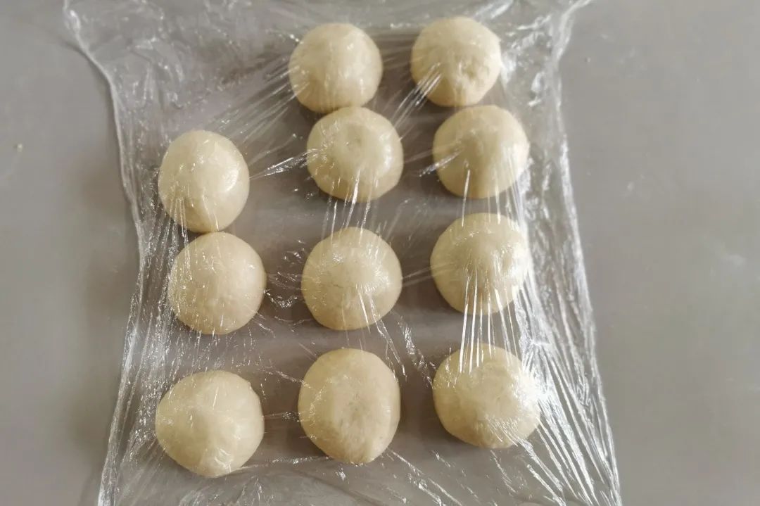 平均分成11个面团,揉圆,覆盖保鲜膜松弛15分钟