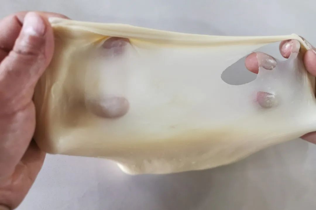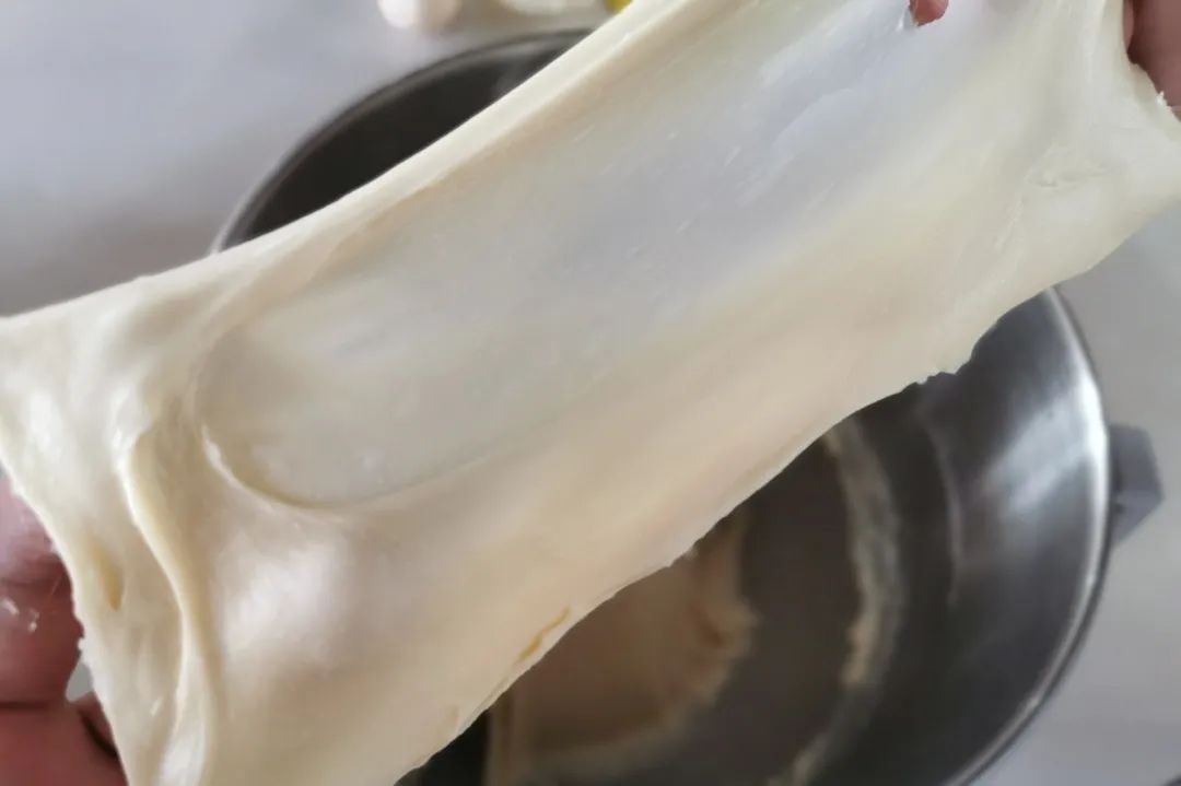 加入黄油,面团搅拌至轻易拉出薄膜,且破口处无锯齿