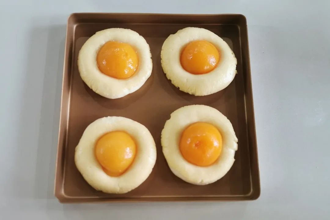 表面放上黄桃,稍微按压一下,放入烤箱上火200℃,下火180℃,14分钟左右,表面金黄即可