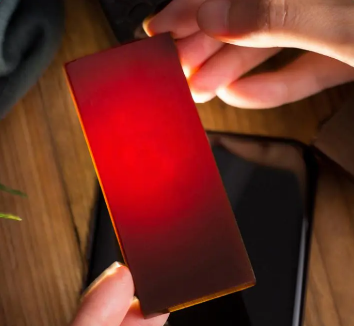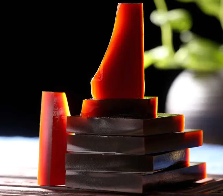 高品质阿胶块,表面平整光亮、色泽均匀;打灯呈现黑中带红,呈棕褐色或琥珀色。
