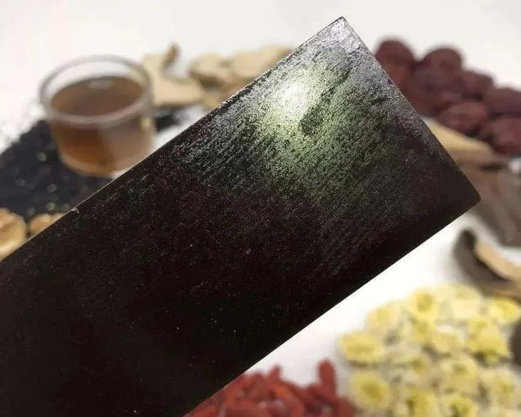 伪劣阿胶块表面色泽乌黑或者明显发黄,粗糙没有光泽,或者光泽黯淡。