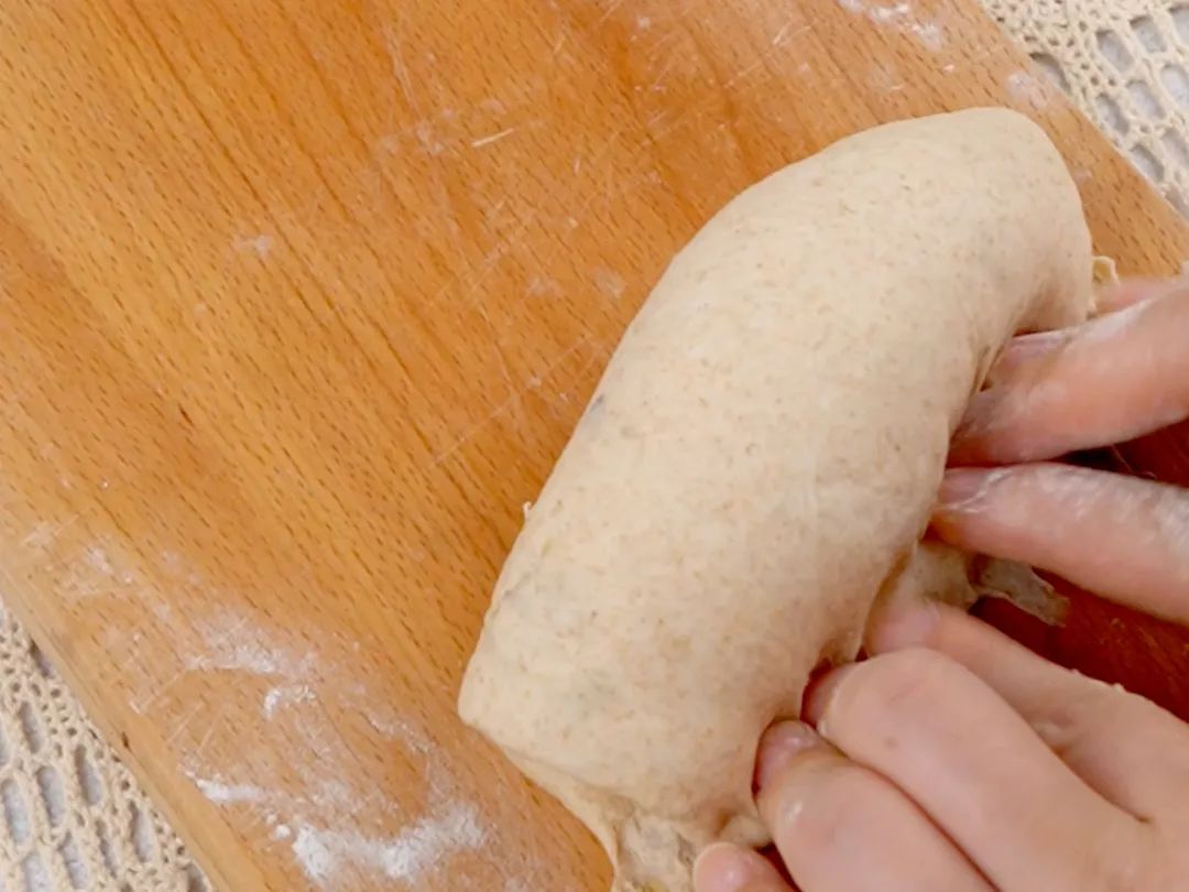 4.擀成牛舌状,翻面,由下往上卷起,两头往里缩渐渐收紧,底部接口捏紧