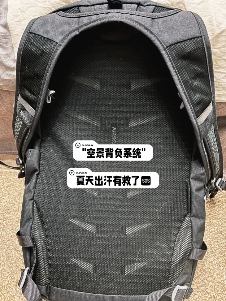 背板用的是类似跑鞋的那种舒服的泡沫材质,自重大概在540g左右,既能装东西,背起来又舒服!
