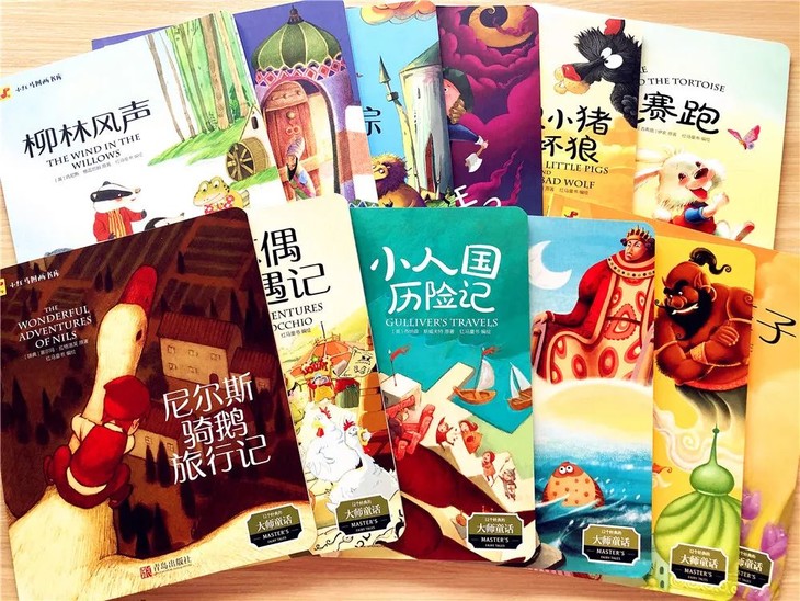 包括:《尼尔斯骑鹅旅行记》《柳林风声》《绿野仙踪》《阿拉丁与神灯》《阿里巴巴和四十大盗》《龟兔赛跑》《吹牛大王历险记》《快乐王子》《三只小猪与大坏狼》《木偶奇遇记》《小人国历险记》《渔夫的故事》